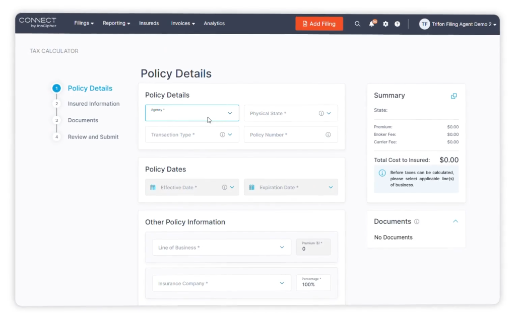 If you're looking for a full suite to calculate, report and file surplus lines taxes, Connect is your best bet. If you just need quick calculations during the quote/bind process, our Tax Calculator will suffice. See a full breakdown of the calculator capabilities below.